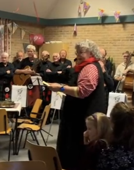 ‘Wat haar ook zo bijzonder maakt is de manier waarop zij omgaat met de meer dan dertig kerels. Een voorbeeld: als Sitta zegt: jullie moeten rokjes aan doen, dan doen ze dat.’ Een toepasselijke opmerking, want het koor stond namelijk aangetreden in Schotse kilts. Dat had trouwens zo z’n reden, want er werden speciaal voor Sitta drie Keltische liederen ten gehore gebracht.