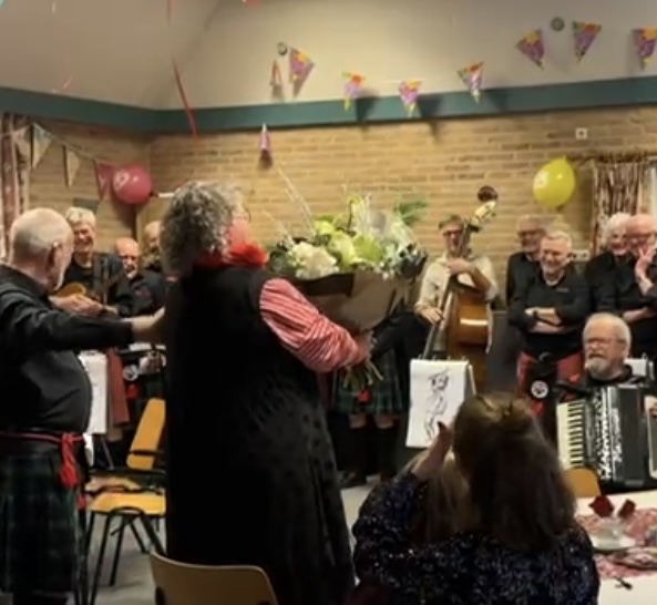 Voorzitter Evert de Jong herinnerde zich nog goed de eerste ontmoeting met Sitta. Die was op een zonnige middag in 2008 in de tuin van de voorzitter. Nu, meer dan 17 jaar later, is Sitta Bosman niet meer los te denken van de Jan de Roas Sjongers. Hij schetste haar als een super muzikaal persoon, creatief componist en arrangeur, ook super energiek en schrijfster van mooie liedteksten.