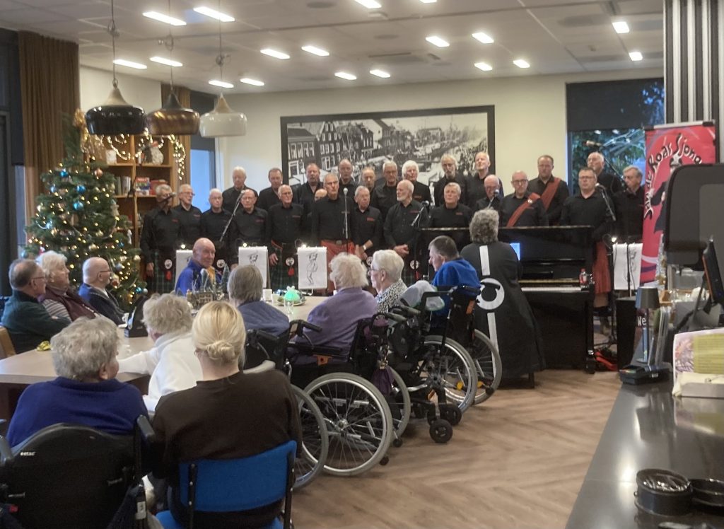 De recreatiezaal van woonzorgcentrum de Miente te Gorredijk is niet heel groot, maar was wel volledig gevuld toen de Jan de Roassjongers daar op 19 december zongen. Omdat we voor de pauze voornamelijk Keltische liedjes zongen, hadden we onze kleding daar op aangepast. Het programma na de pauze stond volledig in het teken van de naderende kerst.